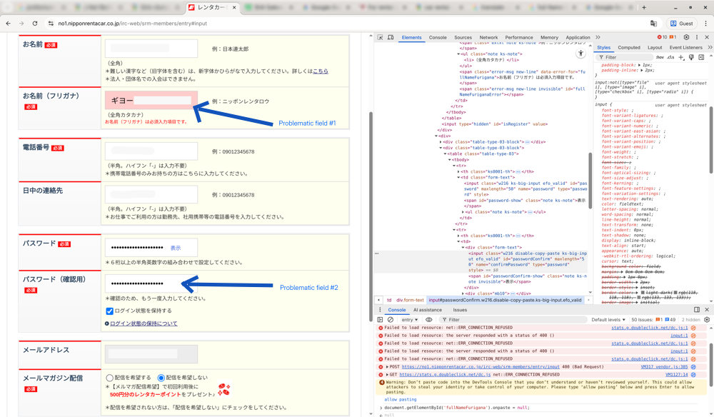 The website disables copy-paste functionality on specific form fields. One of them is the furigana name field, which is particularly frustrating because I obviously don’t have a Japanese keyboard. My usual workaround for those registration (for instance with J-Net) is to Google Translate my English name into kanji characters and paste them in. But this website? It wouldn’t let me paste anything.
